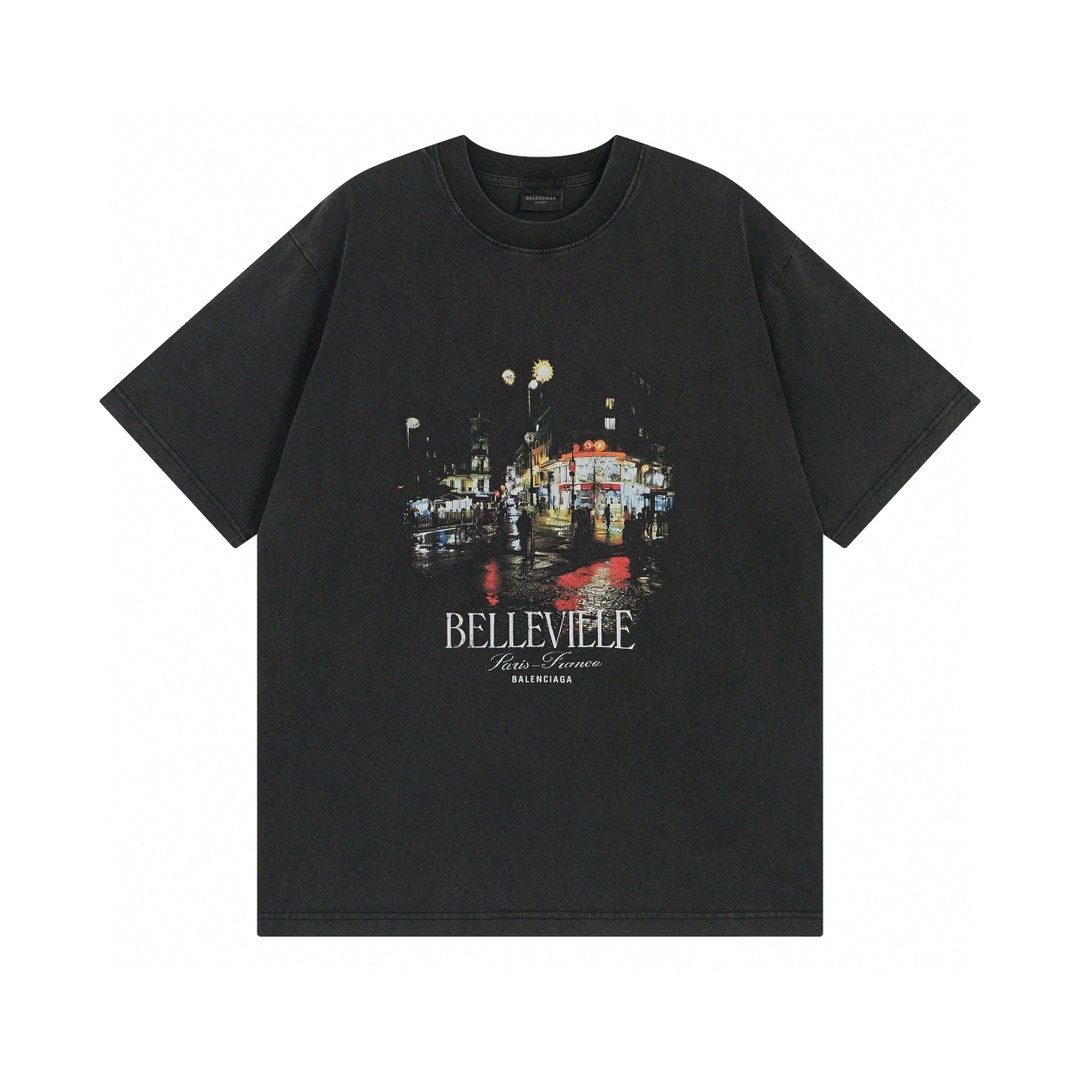 BALENCIAGA 2025 SS Paris Skyline Vintage Wash T-Shirt | 260G Heavyweight Cotton | Distressed Digital Print | Oversized Streetwear